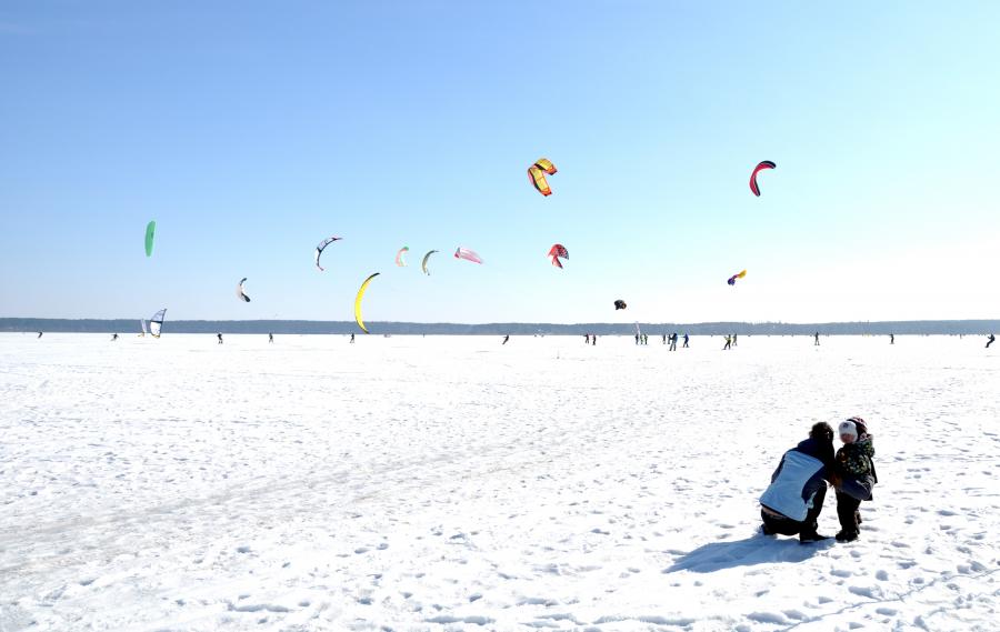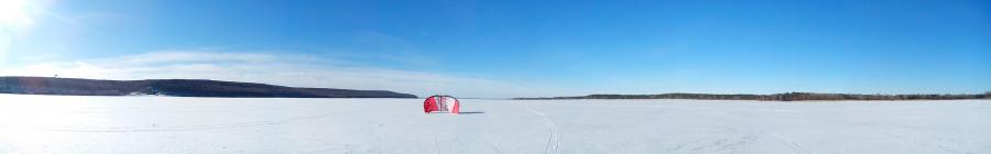 Мы в 10:00 уже поменялись ботинками и начали тестить снаряды друг друга. Я на Санькином борде вспоминал былое, он на моих лыжах учился кататься. Гонялись, проверяли кто круче на ветер идет, менялись кайтами. Через час уже переобулись в свое привычное. Позвонили ребята, сообщили что все в сборе и уже выдвигаются на старт за мост. Теперь нам нужно торопиться. 11:11 - начало моего трека. Лавируемся прямо под мост, но под ним пройти не удасться, низкий очень и лед весь побитый между опорами. Я подъехал вплотную к дамбе, скинул лыжи и взял их крепко в руку. Вторая держала кайт в зените и так с особым вниманием зашел по дамбе наверх, точнее кайт затащил, а потом перешагнув через отбойник, сел на него и начал вертеть головой по сторонам. Мне нужно было перейти автодорогу с двусторонним движением, по которой носятся междугородние автобусы и легковушки. В этот момент Саня уже смотал стропы, собирал свой кайт в охапку. Он выбрал самый безопасный способ преодоления моста. Ладно, вроде машин нет, мне пора перейти. Только подбежав к противоположному отбойнику, ощутил слабеющую тягу кайта. Стропы немного провисли и у меня в голове сразу всплыли разные сюжеты катастроф с участием кайта. Только не это! Взяв под контроль кайт немного махнул, отработал провал ветра. Так преодолел, наконец, второй отбойник с волнением за кайт и собственную безопасность. Спуститься вниз с наветренной стороны дамбы не составило проблем. Встегнулся в лыжи и попер в вперед к ребятам, которые только раскладывали кайты. Саша спокойно перебрался с кайтом и бордом в руках. Значит все в сборе. Нас стартовало 6 человек!Ветер: восток 6-8м/с. Маршрут Салтов- Рубежное- Салтов практически без лавировки на полном ходу 32км! Какая скорость, какие яркие кайты, а как осторожно под проводами ЛЭП пролетали! Это только почувствовать можно. Все вернулись целые и довольные. Потом попили чай и родилась мысль у Димы сходить еще в один поход уже мне знакомый: Салтов- Печенеги- Салтов. Желающих осталось 4: Дима, Юра, Саша и Я. У меня в рюкзаке был еще один какой-то кайт Pansh 5м, который хотел скинуть ребятам, чтобы не брать с собой в поход. Но посоветовавшись, решили оставить его как запасной на случай оказии. Потом он здорово пригодился! Перешли через дорогу уже все со свернутыми кайтами, быстро разложились и стартуем. Все рванули, а у меня кайт Наска 11м запуталась в строповке правым ухом и растрясти не вышло. Пришлось парковать, бежать и выпутать быстро. Потерял минут 5! Потом на середине догнал Сашу, который на борде боролся с плотным встречным ветром возле Хотомлянского разлива, мне самому пришлось здорово упираться в лыжи, иначе стаскивало просто по ветру. Под берегом нас ждала собака-догонялка, с которой поездили не спеша, снял ролик. А впереди еще одна треть маршрута. Ветер кажется нескончаемым, а вот день - нет. Я отрываюсь вперед, так как очень хочется успеть хоть на этот раз до конца водохранилища, до Печенегов. Тут уже навстречу, обратно, несется Дима с камерой в руках. А Юры еще не видно. Буду догонять его. А когда разминулись с Юрой, на горизонте показался край ледяной "трассы". Это так заинтриговало! В 15:00 долетел и уперся в южный край ПВХ. От восторга кричать хочется!!! Ставлю трек на паузу, сделал пару фот, видеоролик и сдох аккумулятор. https://kite.com.ua/forum/picture.ph...&pictureid=456 Пока менял на другой начал переживать, на счет тре