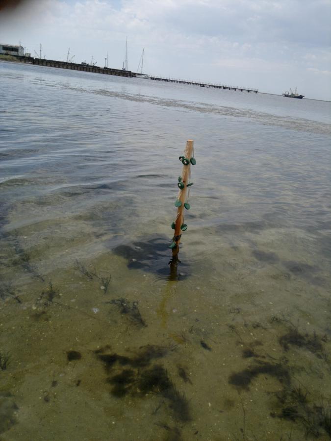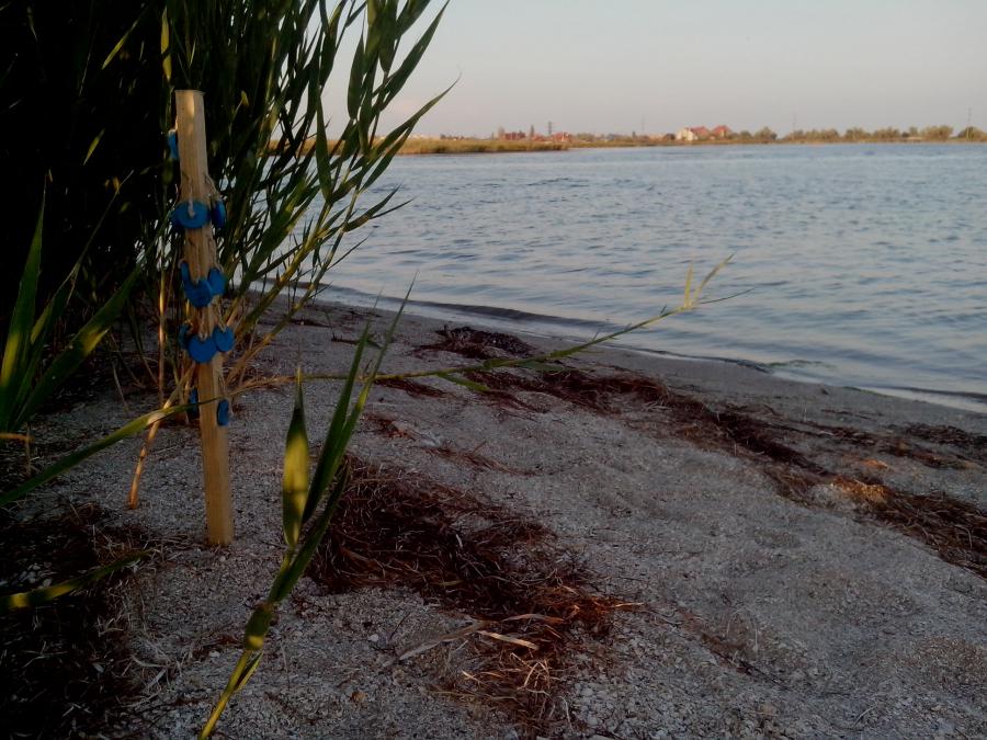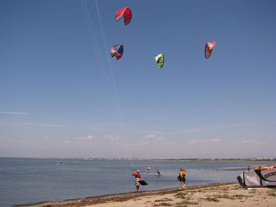 Меня сильно интриговала конкуренция, Санек наверно уже добрался до желтых знаков. Я бежал по берегу и думал о правильном ритме и дыхании. Мне захотелось пить, но жажда победы притупляла этот зной. Еще пару раз пробовал стартовать с внутренней стороны острова, где его изгиб позволял двигаться вслив. Накупавшись в горячей воде и проехав на доске по 20 – 30 метров, пришлось отбросить все надежды на срыв ближайшего 2ж плавучего знака. Я продолжил пробежку по берегу острова. Санек уже тоже вышел на берег и почему-то не пошел за первыми знаками в начало острова. Видимо у него и так было много пиастр на груди. Он бежал в мою сторону. Тогда я решил припарковать кайт и свернуть, сдув центральный баллон. Поперечные не трогал, они тактично держали форму и обеспечивали положительную плавучесть. Взяв в одну руку кайт, в другую доску, бегу и смотрю назад. Где делся салатовый кайт? Вот блин, Саня тоже свернул и теперь может меня догнать. Я собрал все знаки с Острова Дзендзик и уже плыл к Камышевому островку (он виден на втором фото). Когда-то тут можно было пешком перейти, теперь только вплавь. После Камышевого плыл к берегу косы.
