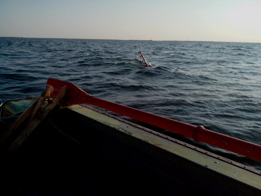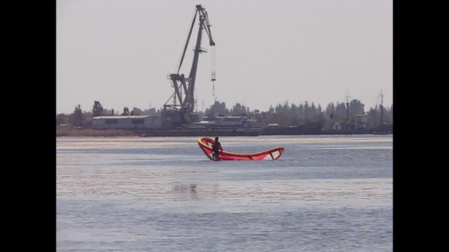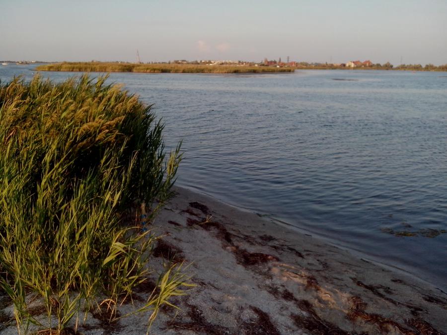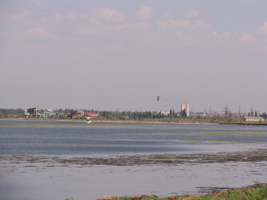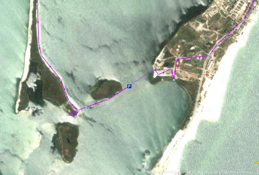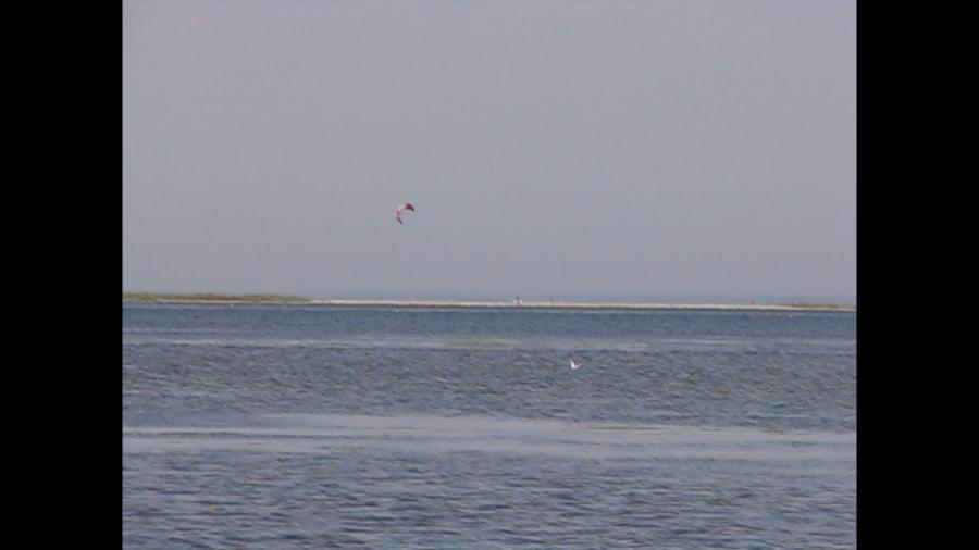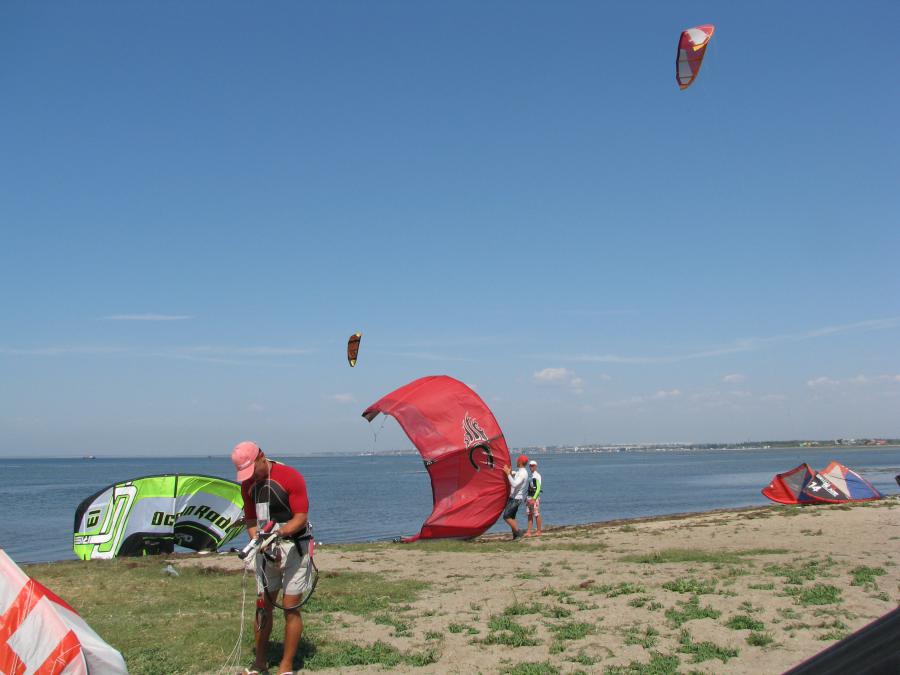 Меня сильно интриговала конкуренция, Санек наверно уже добрался до желтых знаков. Я бежал по берегу и думал о правильном ритме и дыхании. Мне захотелось пить, но жажда победы притупляла этот зной. Еще пару раз пробовал стартовать с внутренней стороны острова, где его изгиб позволял двигаться вслив. Накупавшись в горячей воде и проехав на доске по 20 – 30 метров, пришлось отбросить все надежды на срыв ближайшего 2ж плавучего знака. Я продолжил пробежку по берегу острова. Санек уже тоже вышел на берег и почему-то не пошел за первыми знаками в начало острова. Видимо у него и так было много пиастр на груди. Он бежал в мою сторону. Тогда я решил припарковать кайт и свернуть, сдув центральный баллон. Поперечные не трогал, они тактично держали форму и обеспечивали положительную плавучесть. Взяв в одну руку кайт, в другую доску, бегу и смотрю назад. Где делся салатовый кайт? Вот блин, Саня тоже свернул и теперь может меня догнать. Я собрал все знаки с Острова Дзендзик и уже плыл к Камышевому островку (он виден на втором фото). Когда-то тут можно было пешком перейти, теперь только вплавь. После Камышевого плыл к берегу косы.